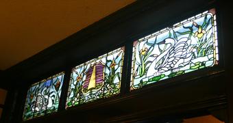 “The black and white window frames of the pub appear to be part of the original colour scheme. The pub contains some fine leaded windows.