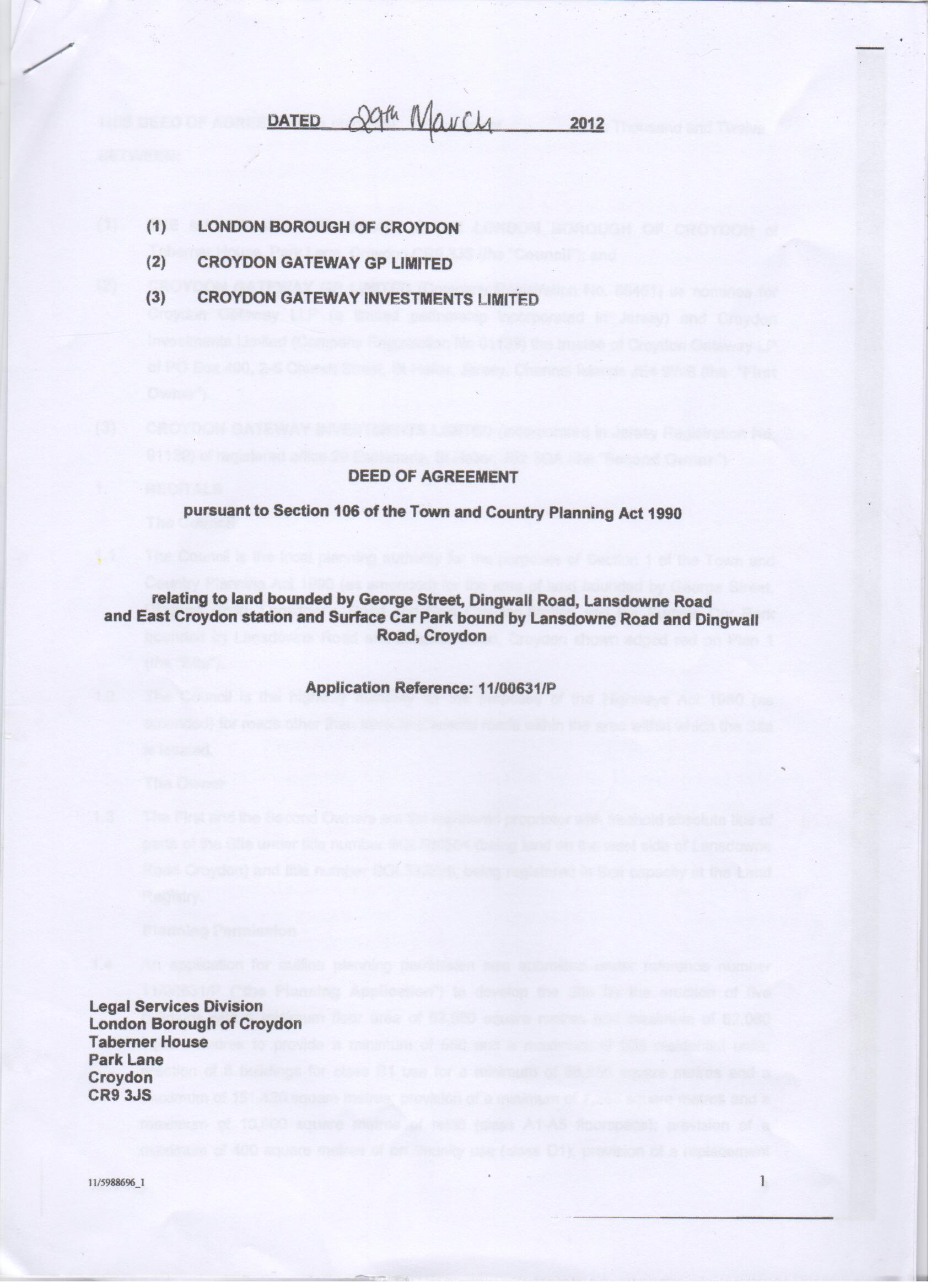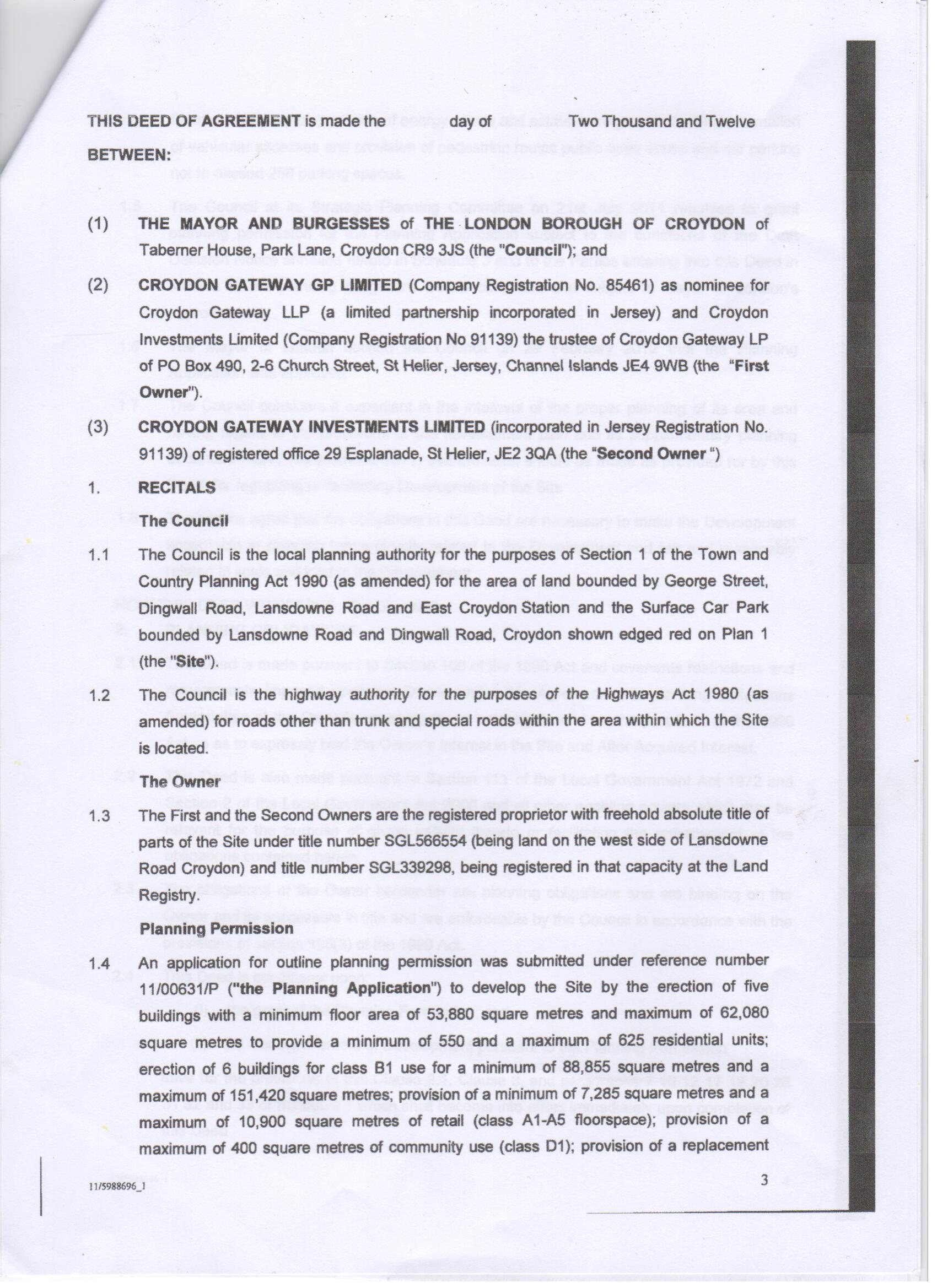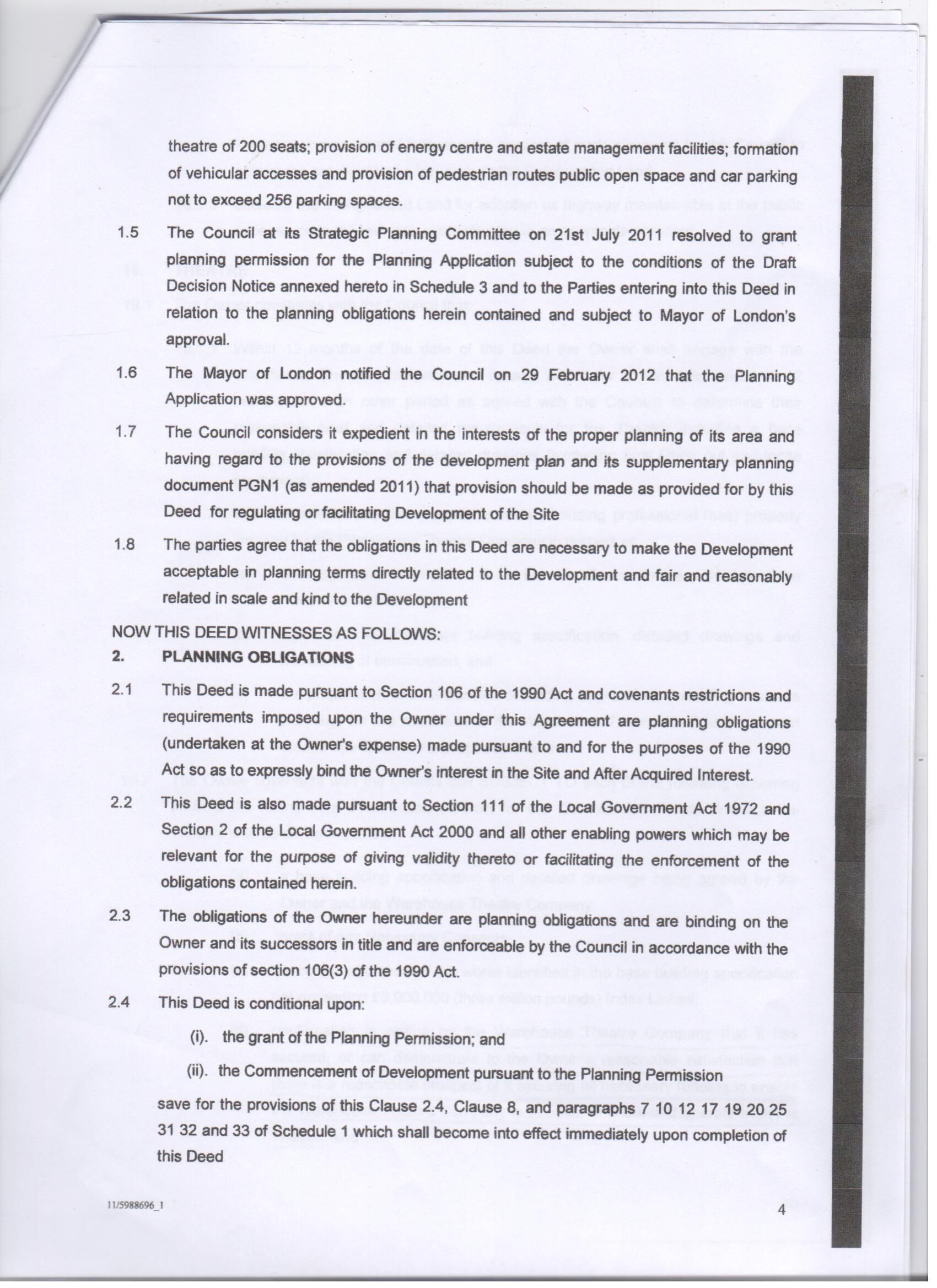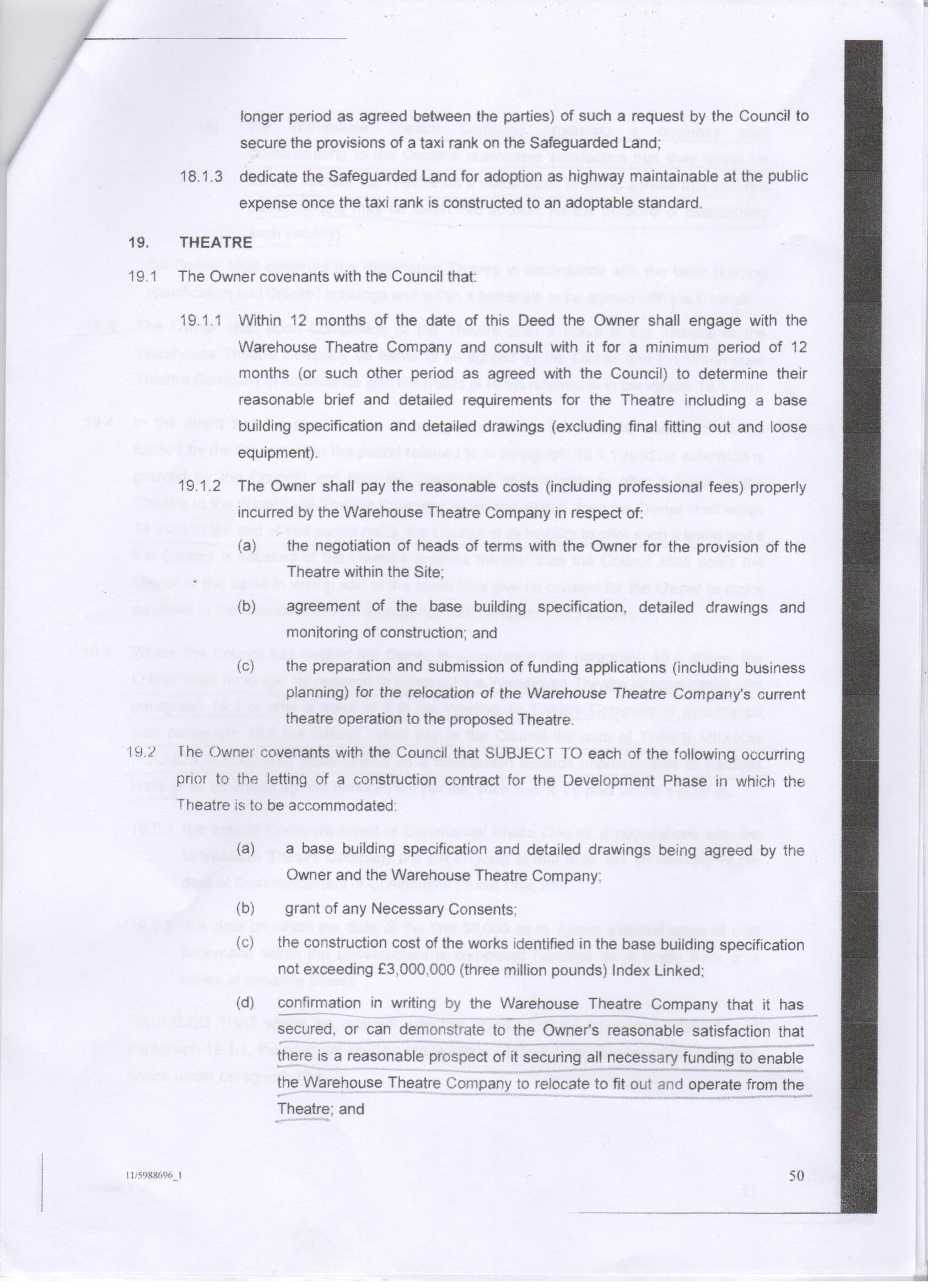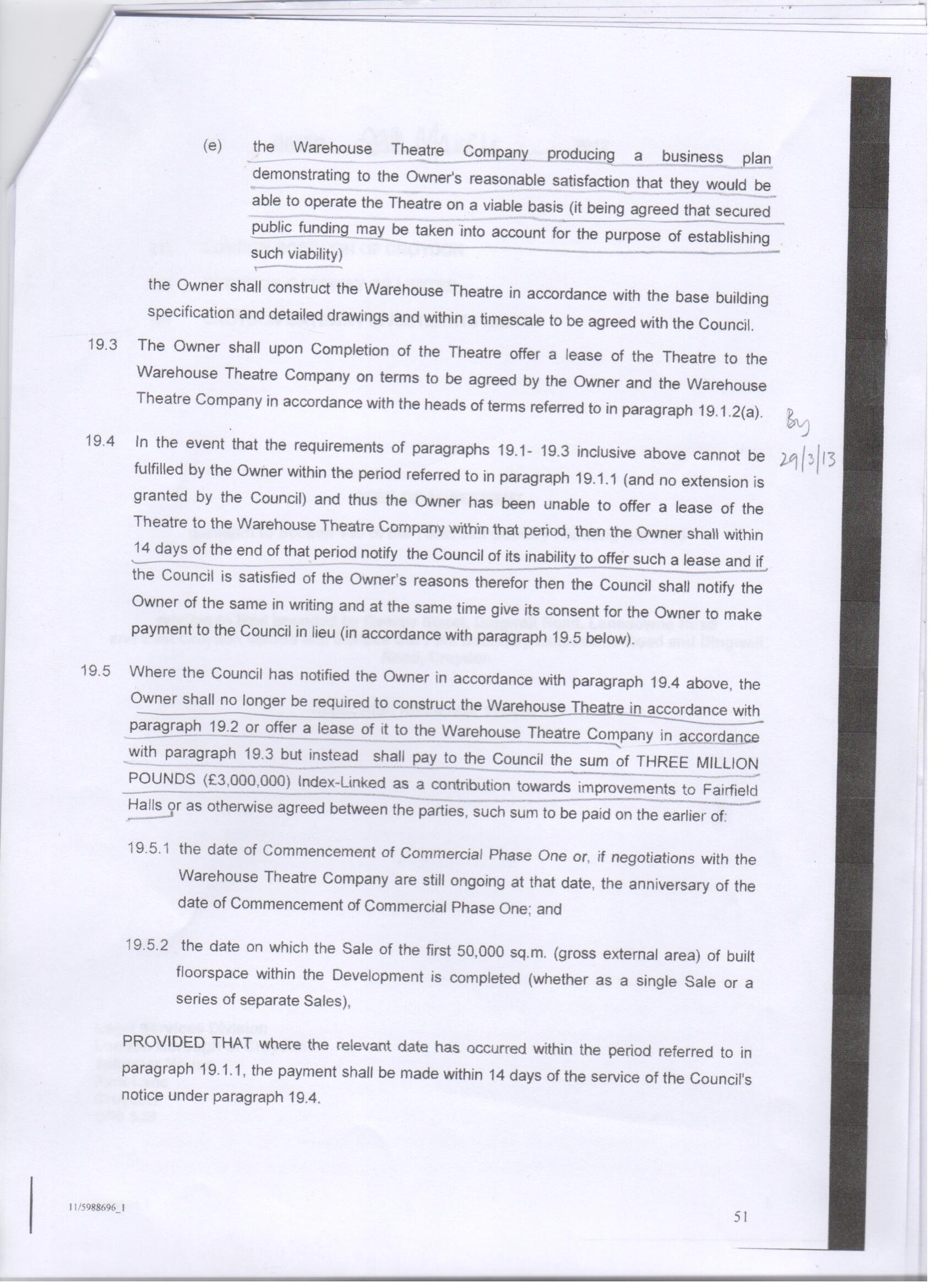 We reproduce here some of the key pages from the deed, drawn up in March this year, which Croydon Council has presented to developers Stanhope, demonstrating the greedy grab for the £3 million grant that had been promised to provide a new Warehouse Theatre.