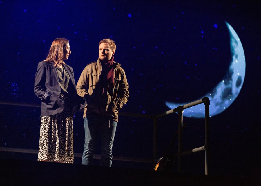 It’s when the music stops that Once runs into problems on stage. The tone of the dialogue oscillates wildly from the cooky and even surreal whims of Emma Lucia’s unnamed girl, to the serious themes of loss and fear, with the former regularly undermining the latter. The stakes of the play are about pushing Healy’s lead character to overcome his anxieties about failure so that he can pursue music. At the same time, our two leads are drawn closer together into a relationship that Lucia’s character feels incapable of fulfilling.