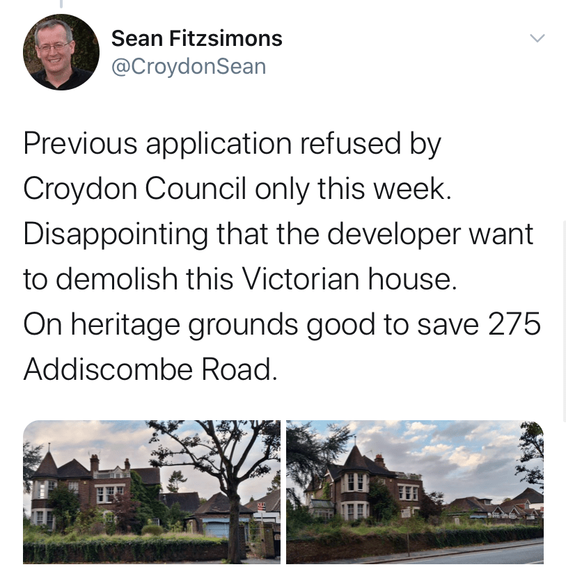 “Disappointing that the developer want[s] to demolish this Victorian house,” Sean Fitzsimons, a Labour councillor in Addiscombe West, tweeted.