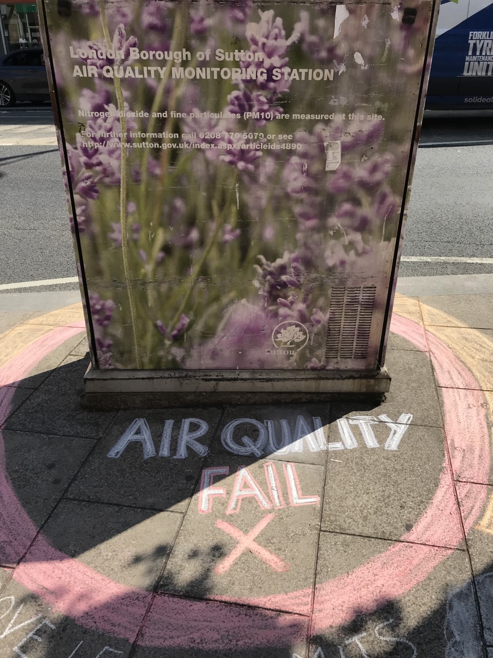 Over the summer, Carshalton resident Verity Thomson created a chalk design on the pavement around the air quality monitor to highlight the problem. Thomson has linked in with “Mums for Lungs”, the group campaigning for clean air.