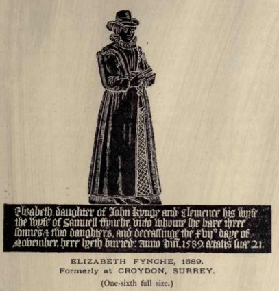 The church registers and the brass plaque under the figure tell us much more about Elizabeth. She was the daughter of John and Clemence Kynge. John was a brewer. Her marriage to Samuel Fynche, the Vicar of Croydon, was on March 5 1582, a year after Samuel started the job here. It suggests that Elizabeth may have been just 14 at the time.