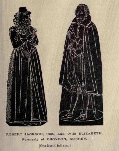 This brass contained two small figures. One represented Robert Jackson, the other Elizabeth, his wife. Both the figures were dressed in the fashion of the Stuart age. The male figure was just over 16 inches tall, with the female one just over 15. The figures were turned towards each other. The man has a moustache and beard and wears a short cloak.